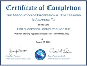 - Completed “Working Aggression Cases From 10,000 Miles Away” through the Association of Professional Dog Trainers (APDT)
