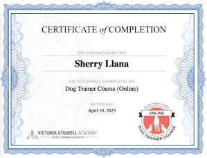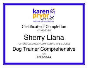 Hi, my name is Sherry. I am a wife and partner to one amazing human, and a mom, guardian, and snack leader to two awesome Australian Shepherds. I grew up with dogs and cats and have been around them for most of my life. I realized that it’s my passion to learn all about dogs when my first personal dog, Lucy, experienced her first ever “panic attack” during a Rally Foundations class in 2020. She was diagnosed by our veterinarian with canine noise aversion/anxiety. I wanted to understand how it started, or why it started, so I could help her. All the hows and whys led me to pursuing different courses, seminars, and webinars, classes and conferences from various dog trainers and behaviorists all over the world (no kidding!).