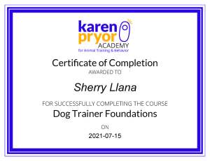 I completed Karen Pryor Academy (KPA) for Animal Training & Behavior Dog Trainer Foundations Course in July 2021 and their Comprehensive Dog Trainer Course in March 2022. Several months of studying and working to get my certification, I then became a certified Family Dog Mediator (FDM) through Kim Brophey’s L.E.G.S. Applied Ethology Professional Course and graduated as a Certified Dog Trainer through Victoria Stilwell Academy for Dog Training & Behavior. I LOVE learning all about canine behavior! I LOVE that after all the studying and educating, I am now better at reading canine body language, understanding their behavior and their emotions, and why they do what they do at the time they do it in the environment that they are in.